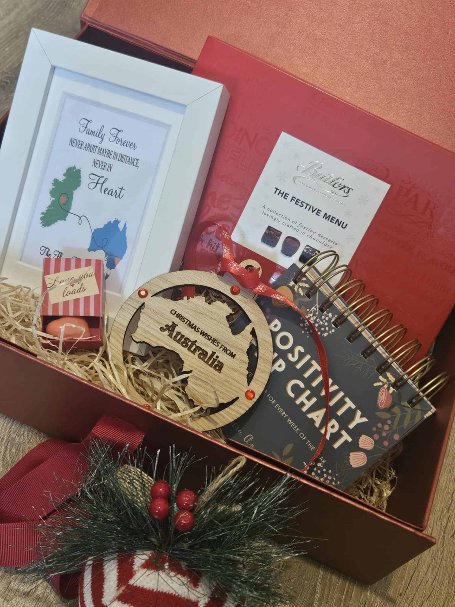 This gift box comes with a personalised frame ( this could be black or white depending on stock ), positivity flip chart, Butlers chocolates, ceramic heart, Love you loads and an Australian Oak Bauble.